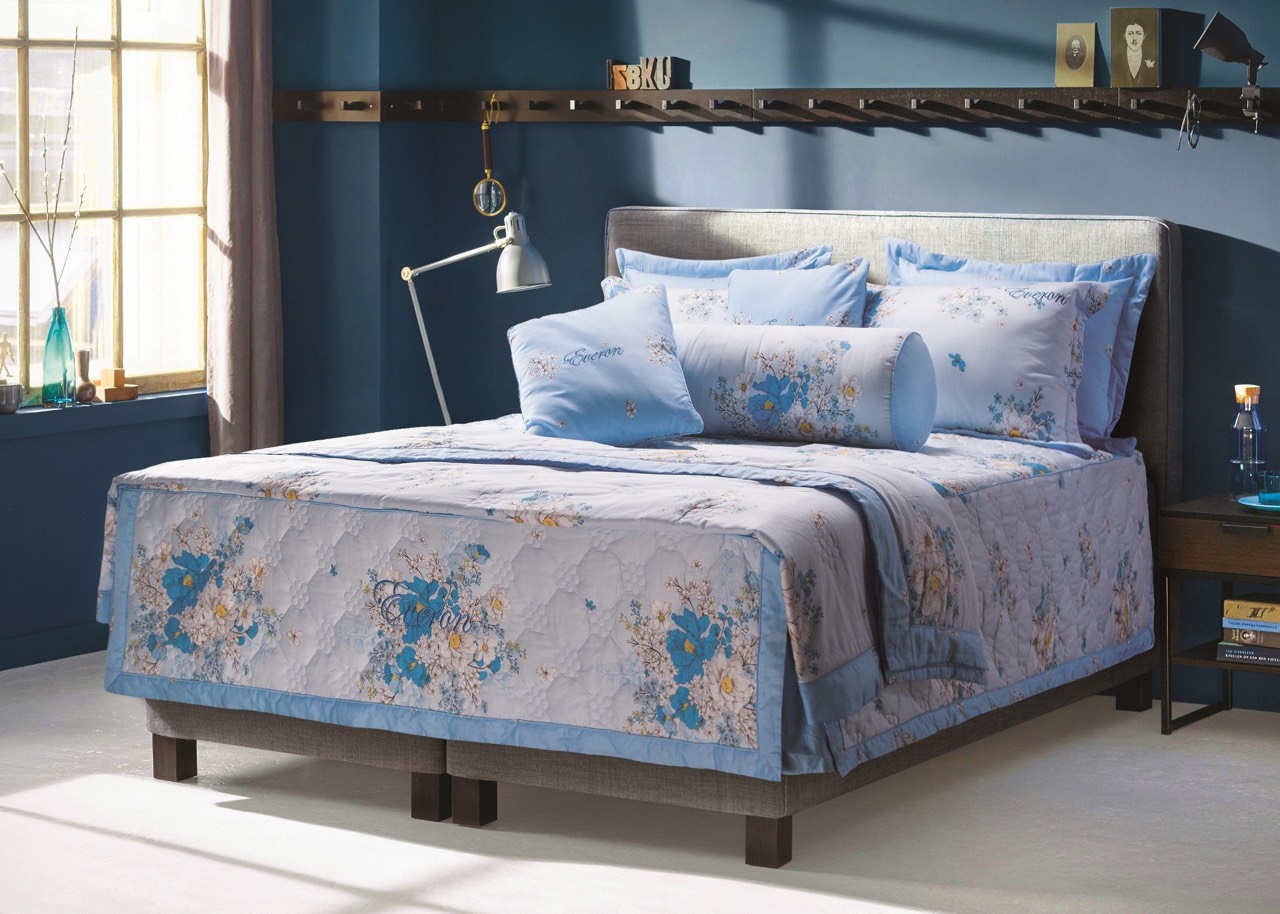 Bộ chăn ga với tông màu xanh dương mát mắt, hình ảnh những cánh hoa baby rải rác khắp chăn, mang lại 1 sự nhẹ nhàng tinh tế.