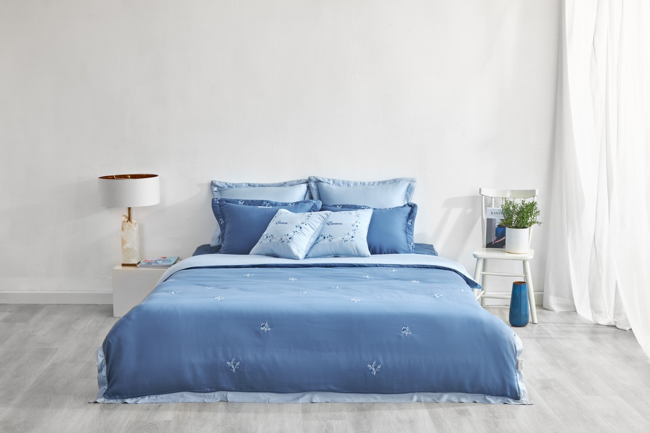 Những sự điểm xuyết ngẫu hứng đôi khi lại mang đến hiệu quả bất ngờ. Những cành hoa nhỏ xinh đặt ngẫu hứng trên nền vải tencel màu xanh dương, không sắp đặt cầu kỳ nhưng lại khiến người dùng cảm nhận tốt nhất sự mềm mịn bay bổng của dòng vải thiên nhiên này đem lại. Hiện đại, nhẹ nhàng và tinh tế là những điều bạn có thể tìm thấy ở bộ chăn ga này .
