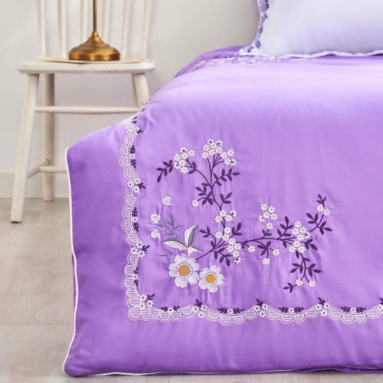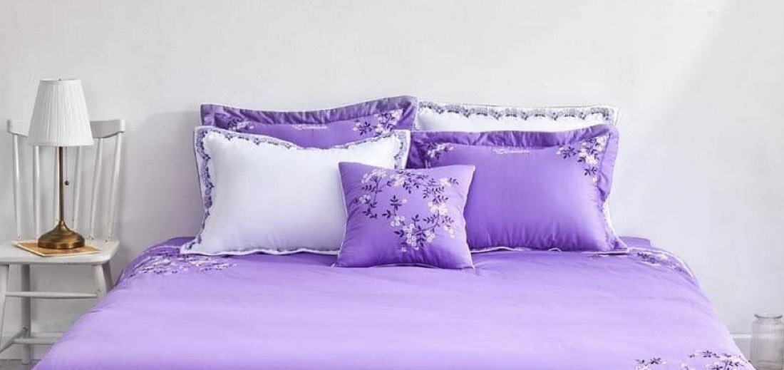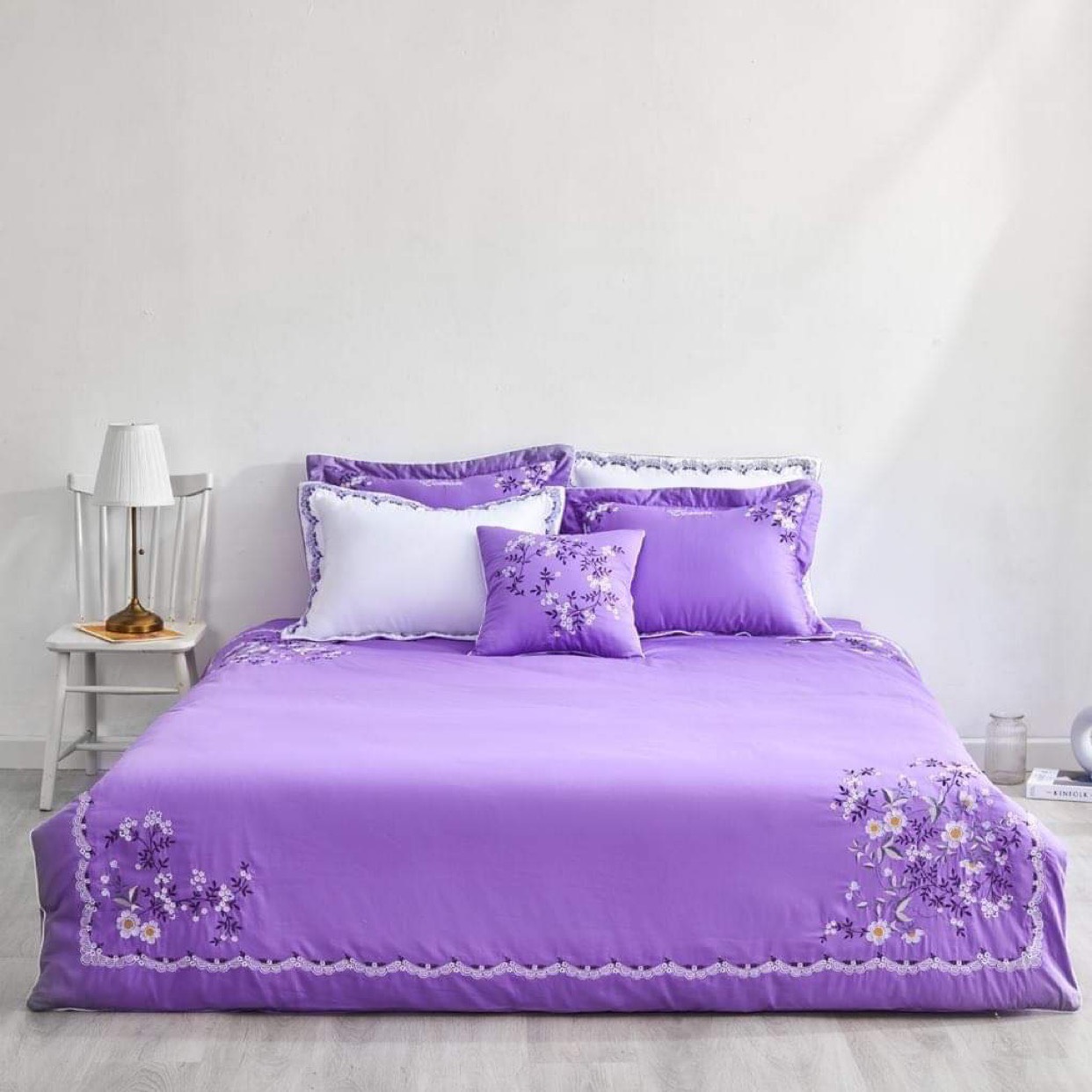 Điểm nhấn của bộ chăn ga là hình thêu theo kiểu đáp vô tuyến, hai hình góc hoa văn đối nhau từng chùm hoa tạo sự cân xứng. Bạn sẽ ấn tượng với những bông cúc họa mi nhỏ điểm xuyết trên nền vải tím ngọt ngào. Màu tím đậm của bộ chăn ga sẽ đem đến cảm giác ấm áp và cũng sẽ luôn là sự lựa chọn cho các quý cô thích sự lãng mạn.