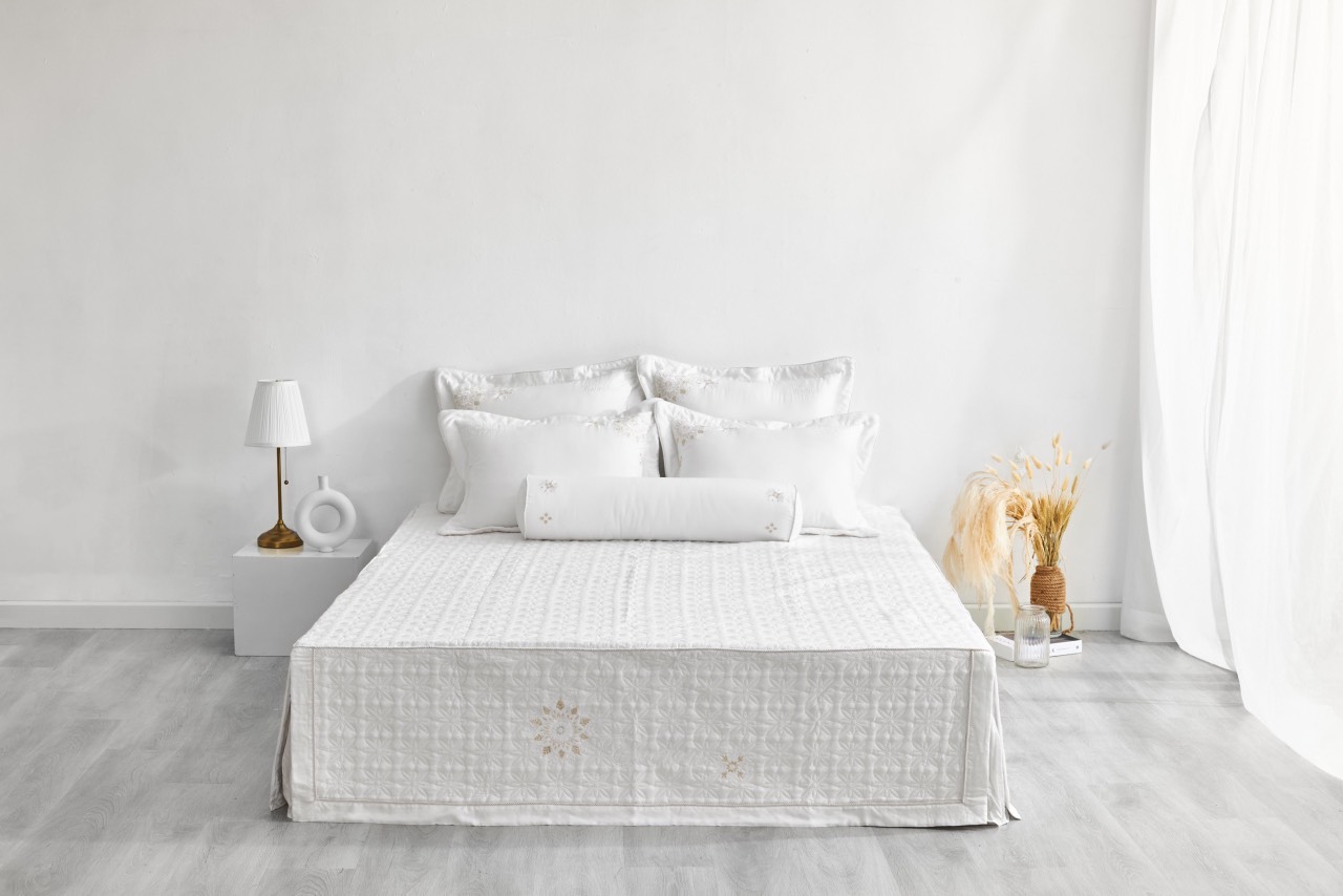 Màu trắng tinh khôi cũng là một trong những màu sắc chăn ga được chọn lựa rất nhiều cho ngày cưới – ngày trọng đại của đời người. Không rực rỡ như váy cô dâu, không màu mè, hoa lá, bộ chăn ga trắng EST21034 vẫn thu hút tất cả ánh nhìn và mang đến cảm giác hạnh phúc lạ kỳ.