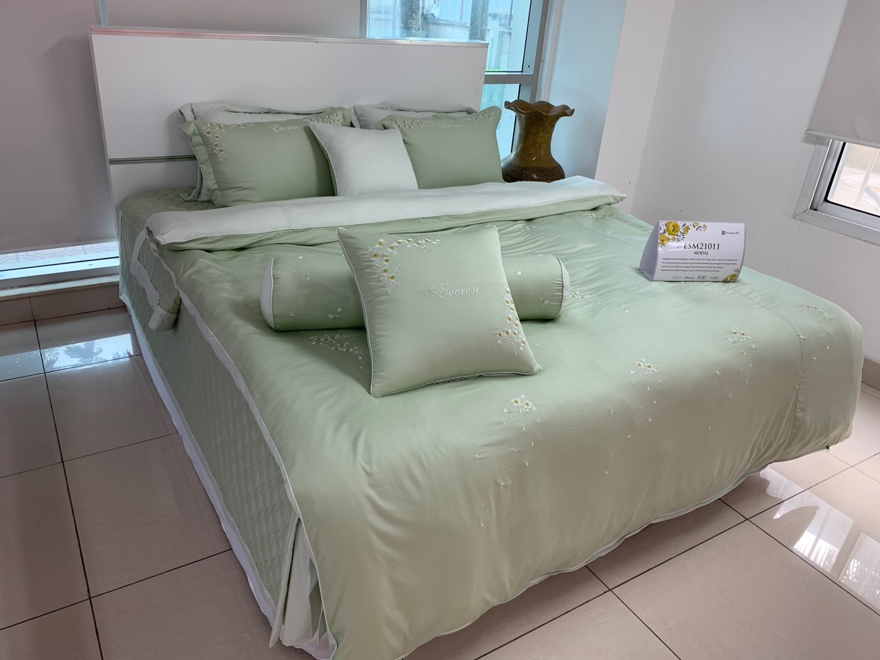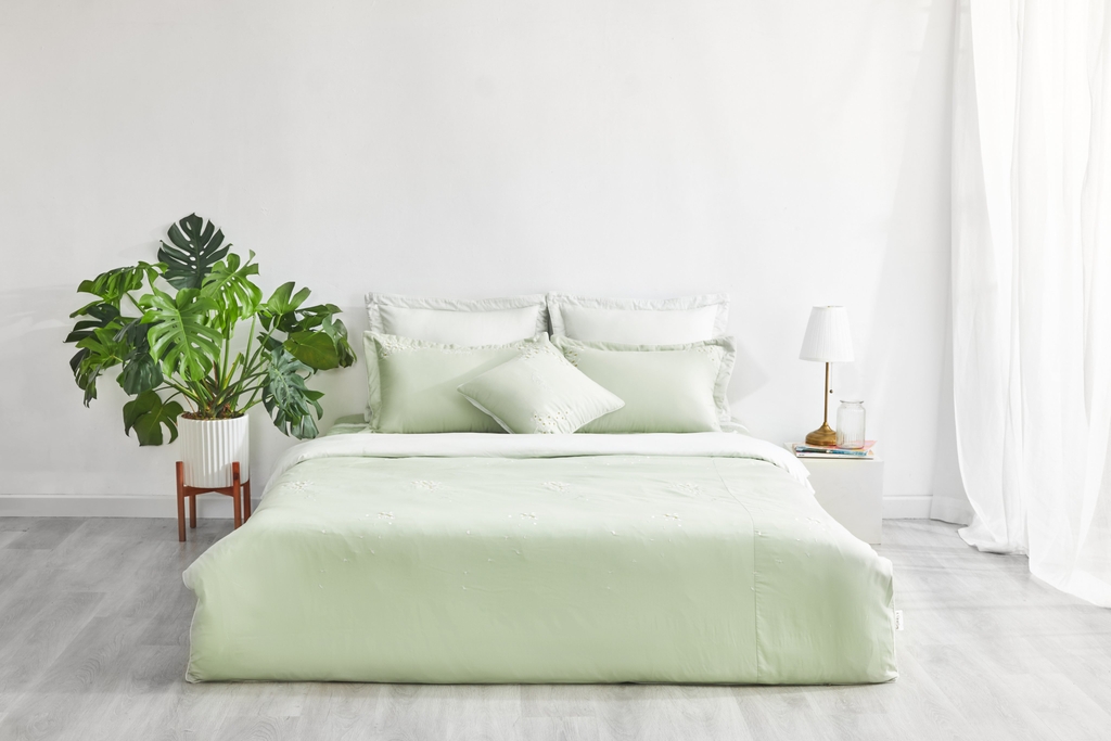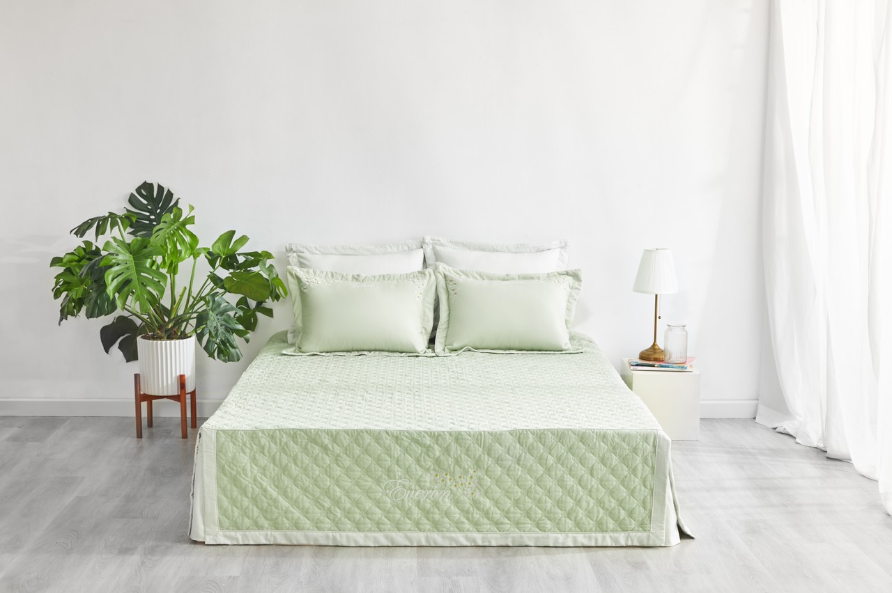 Với thiết kế là vải một màu màu xanh lá cây được trang trí bằng những điểm hoa thêu đơn giản nhẹ nhàng. Bộ ra phù hợp với những căn phòng được bài trí theo phong cách hiện đại.