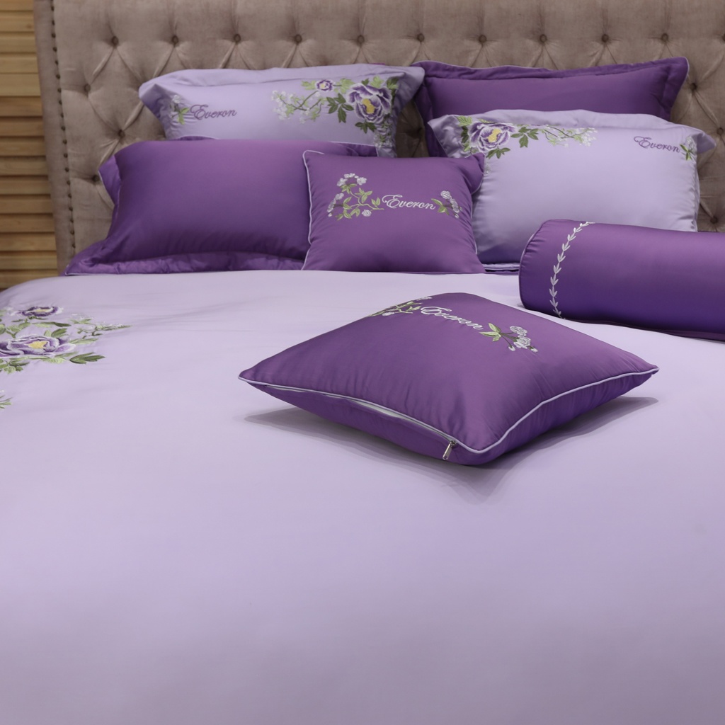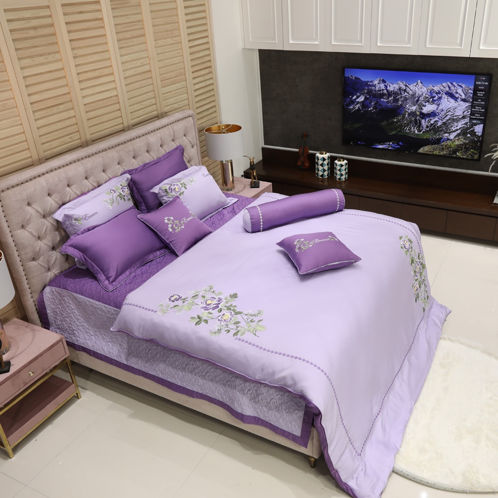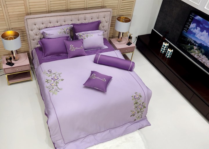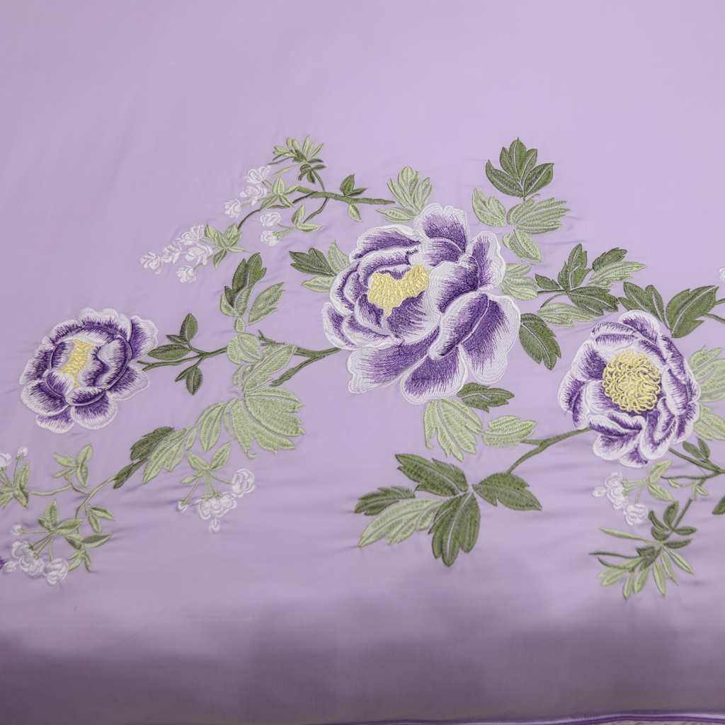 Bộ chăn ga được thêu nhưng bông hoa mẫu đơn trên nền vải tím rất phù hợp cho mùa cưới.Kiểu thêu dày mũi chỉ làm nổi bật từng đóa hoa to là điểm nhấn và kết hợp cành lá xanh trên nền vải tím tạo phản ứng màu sắc cho mắt nhìn thật lạ mắt.
