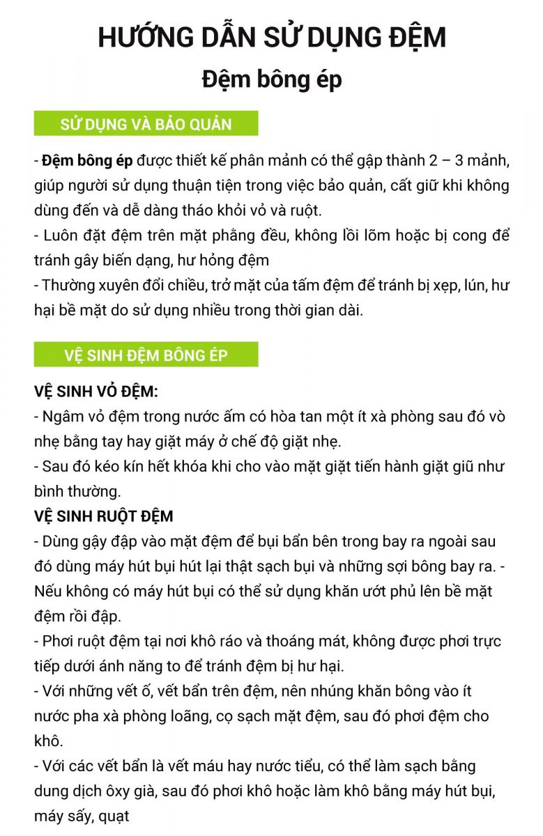- Nệm bông ép có độ phẳng cao, không bị xẹp, lún, biến dạng, cho thời gian sử dụng lâu dài. Độ đàn hồi cân bằng 5 vùng trên cơ thể tạo cảm giác êm ái, thoáng mát, không gây đau lưng, cột sống sau khi ngủ dậy.